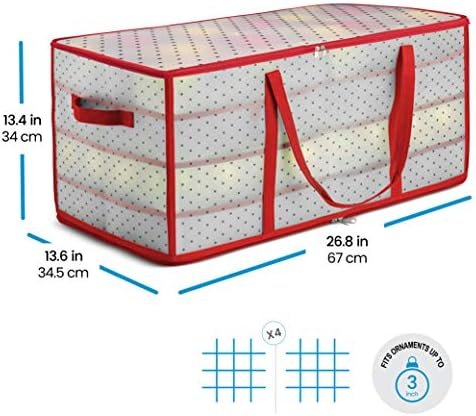 Product Details Material: Made of vinyl plastic Color: Red Capacity: Keeps up to 128 ornaments Dimensions: 26.8″ x 13.6″ x 13.4″ Size: Holds up to 3 – inch round ornaments Assemble: Comes with instructions for easy assembly